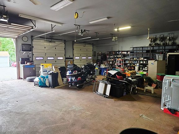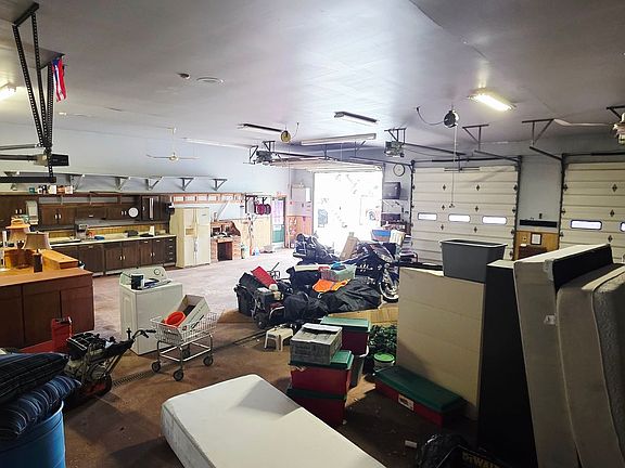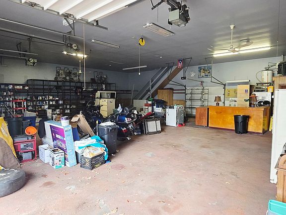 Discover this spacious 3-bay garage featuring soaring 12 foot ceilings, oversized 10 ft. high bay doors, floor drainage, heating, hot water, a bathroom, ample lighting, and a ventilated attic with a second-story garage door for added storage.