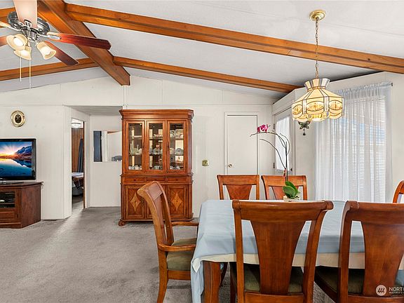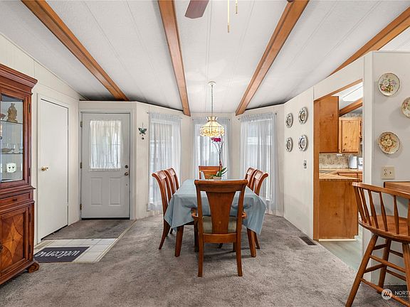 Nestled in this development on a desirable lot sits a well kept home. Covered front porch greets you leading to a spacious and open interior with high ceilings accented w/ exposed beams, open floor plan includes dining, living & kitchen area. 2 bedrooms & 1 full bathroom situated on one side of the home. Spacious primary bedroom on opposite end of the home with attached full bathroom & laundry area. Venture to the backyard where you will be welcomed by beautiful mountain views from the back deck. Covered seating area for unwinding. All of this surrounded with mature landscaping giving tons of privacy. Fenced/irrigated yard with personal storage on the lot. 1 car carport. Pet friendly policies allow cats & dogs under 50lbs. See park rules!
