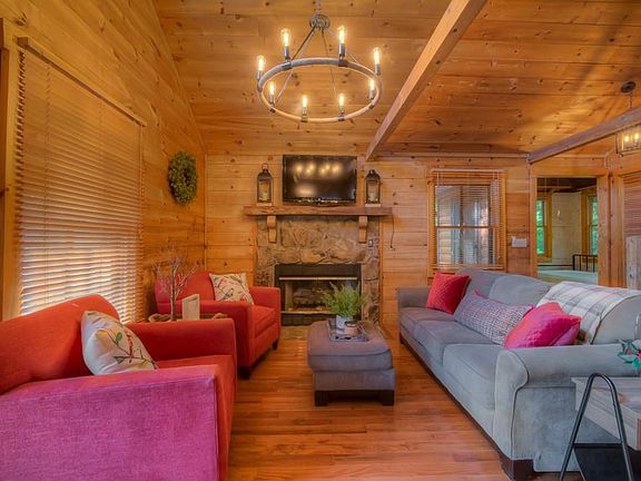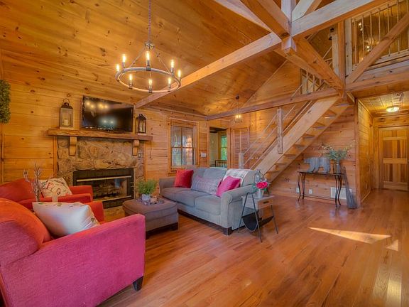 Looking for the perfect place to relax? This Swiss style cabin offers unique touches and character throughout. All furnishings come with the home and many are brand new. With over an acre, this cabin features 2 bedrooms on the main level, a kids loft with custom bunk area, custom built stairs and railing, additional sleeping or keeping room, an open living room/dining/ and kitchen area, new lighting, stone gas fireplace, large front porch, circle driveway, partial room below for storage, storage cottage, and washer/dryer/grill to complete the home. This cabin could be the perfect turn key experience for anyone looking for a vacation rental or investment opportunity.