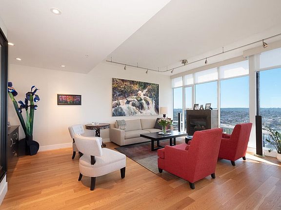 Simply stunning sub penthouse at Park West One. South, West, & North, ocean, mountain, & park views. This spacious, bright 3 bedrooms & den 2 1/2 baths home has windows on 3 sides & 10" ceilings. Enjoy a large deck with SW views. The home has been beautifully upgraded with a timeless exquisite renovation. The kitchen has natural white oak cabinets, quartz counters, & Miele appliances. Upgraded baths, custom designed closets, oak built-in shelves, hardwood floors throughout, electric blinds, gas fireplace, & air conditioning. The windows are upgraded to double laminated insulating glass to noise & harmful UV rays, & reduces BC Hydro costs. 4 parking, a bike, & storage locker. Enjoy Club Viva with a pool, gym, guest suite, concierge, & more. Appointment Friday Oct 3rd 4-6PM 24 hours notice