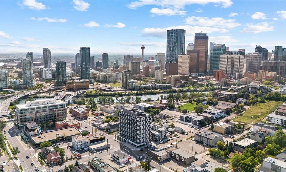 Welcome to your stunning top floor unit with breathtaking view of Calgary Downtown, Fourth Ave bridge over the Bow river, an enchanting Air BnB friendly, modern air-conditioned condo. Minto partnered with PCL, to design and construct this 2023 building, that perfectly blends style, comfort, and convenience. This bright and airy 2-bedroom, 2-bathroom home features a contemporary open-concept layout with large windows that flood the space with natural light. The sleek kitchen is designed with functionality and aesthetics in mind, offering an island with an eating bar, perfect for casual dining or entertaining. A spacious dining area flows seamlessly into the cozy yet open living room, creating a welcoming atmosphere for both everyday living and hosting guests. Step out onto the expansive private large wrap around balcony—ideal for morning coffee, evening relaxation, or summer BBQs. The primary bedroom is a true retreat, complete with a private 4-piece ensuite, while the second bedroom and bathroom provide comfort and flexibility for guests, a home office, or growing families. Thoughtfully designed with modern finishes throughout, this unit offers a perfect blend of practicality and style, making day-to-day living both easy and enjoyable. Situated in a desirable, amenity-rich neighborhood, this location offers the best of both convenience and lifestyle. Just steps from your door, you'll find an array of local cafes, restaurants, and boutique shops that give the area its unique charm. Enjoy leisurely strolls or active outings along nearby riverside pathways and green spaces, or take advantage of the close proximity to fitness centers, grocery stores, and essential services. Public transit is easily accessible, simplifying your commute whether you're headed downtown or exploring the city. With everything you need within reach—including your own spacious balcony oasis—this is a home that truly delivers on comfort, location, and modern living.