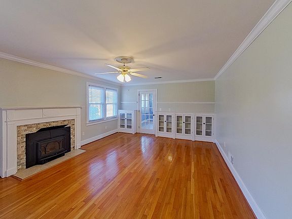 Wood-burning fireplaceStainless steel appliancesHardwood floorsSoft-close doors and drawersGranite countersBuilt-in glass front bookshelvesCrown molding