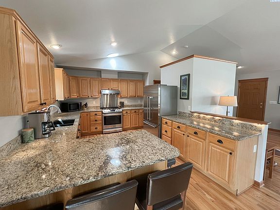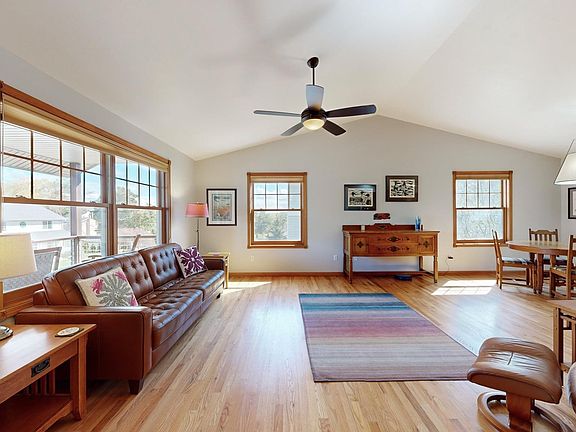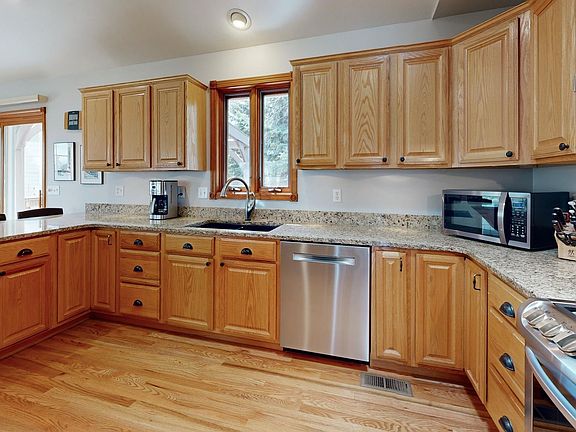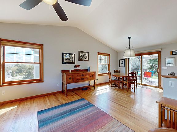 MLS# 275270 Gorgeous home sited on a spacious lot with private, fenced back yard. Special features include covered front porch, beautiful hardwood floors, doors and molding trim, vaulted ceiling in living room, skylights, remodeled primary bathroom with walk-in closet. Large kitchen with excellent pantry storage. 4 bedrooms, 3 baths, gathering room with gas fireplace in basement. Spend the warm summer evenings on your large deck in shaded back yard!