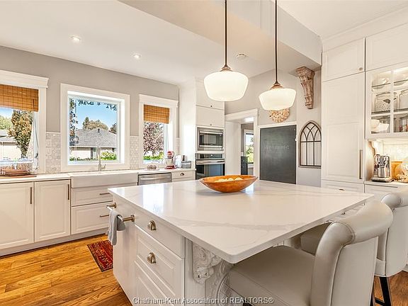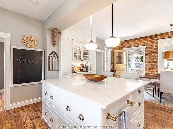 Timeless Victorian charm meets modern comfort in this beautifully renovated 4-bedroom, 1.5-bath home on one of Chatham’s most prestigious streets. Set on a spacious corner lot with a tree-lined driveway, this property offers a welcoming feel that continues throughout the home. At its heart is a stunning kitchen and dining area, highlighted by exposed brick, quartz countertops, tiled backsplash, large island, coffee bar, and glass-door cupboards. From the back entrance, step down to a convenient basement mudroom or up to the main level, where the warmth and style of the home invite you to stay and relax. The main floor also features a cozy family room with fireplace, a versatile bedroom, an office/library, and a bright laundry area with backyard access. Upstairs, three generously sized bedrooms are paired with a luxurious 5-piece spa-like bath complete with soaker tub and separate shower. The basement provides abundant storage space and a practical area for tools or hobbies. Flooded with natural light, the home flows seamlessly outdoors to a tiered deck offering both sun and shade, a fenced yard, garden shed, and covered front porch, along with a converted man cave easily restored to a double car garage. With incredible curb appeal and the perfect balance of character and modern updates, this Victorian gem truly has it all.