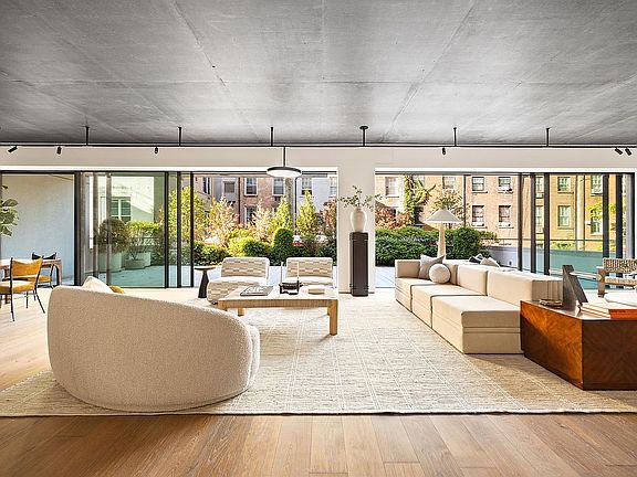 • A striking, 47' wide great room that looks Northwest over the expansive private terrace for views of the neighboring prewar townhouses and their lush gardens below. The entertaining space is complete with a sliding floor-to-ceiling ionic door system, adjacent powder room and thoughtful storage space.