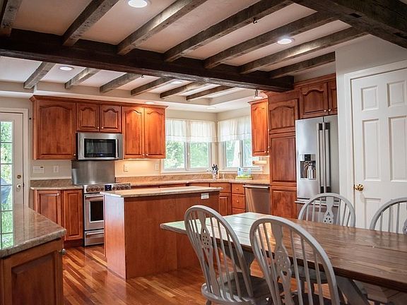- Kit Dscrp: Pantry, Dining Area, Flooring - Hardwood, Countertops - Stone/Granite/Solid, Deck - Exterior, Kitchen Island, Stainless Steel Appliances, French Doors, Ceiling - Beamed, Wood / Coal / Pellet Stove, Washer Hookup, Dryer Hookup - Electric
