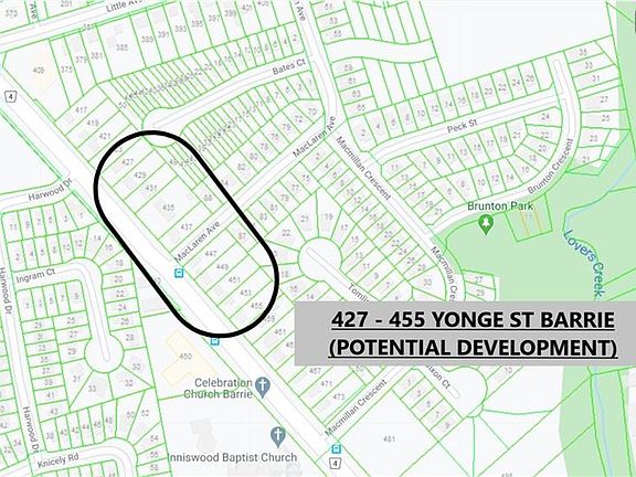 Has single family detached dwelling on property - treat as potential development lot or investment. Adjoining properties, for land assembly also listed for sale *Potential Development* 3.02 Acres* Listed For Sale in Barrie close to Minet's Point/Waterfront. (note one lot is a double 120 FT x 200FT) while all others listed for sale are 60FT x 200FT ; Treat as potential development lot or investment. Properties to be sold in groups: Option 1): 427 - 455 Yonge Street, Barrie as a whole group or, Option 2): 427 - 437 Yonge Street Barrie block or, Option 3): 447 - 455 Yonge Street Barrie block 455 tenant occupied; presently month-to-month paying $1100 per month; 3 bedroom/1 bath. Ask for a full information package regarding potential development in the area and other proposals and influences. intended sale for future development; please do not go on property without appointment; covid precautions must be taken when appt confirmed.