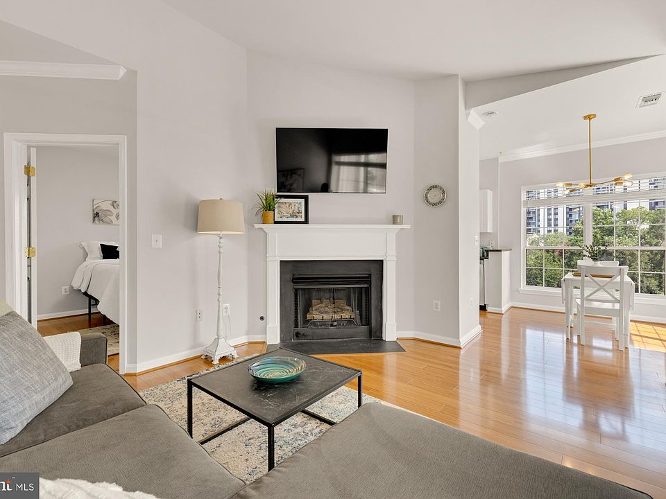 Welcome to Unit 2405, the serene penthouse you’ve been waiting for! Perched on the top floor, this stunning 2-bedroom, 1-bath corner unit offers unparalleled privacy, vaulted ceilings, statement fireplace, abundant natural light, and sweeping views of the peaceful woodlands. With a bright, unique, open-concept layout, 2 private covered balconies, soaring tall ceilings, in unit washer/dryer and assigned garage parking space this penthouse is one of a kind. What makes this unit stand out? This meticulously maintained condo features newly installed granite countertops, gleaming hardwood floors throughout, fresh neutral paint, new cordless blinds, and upgraded smart thermostat. The beautifully designed kitchen, sunlit corner dining area with floor-to-ceiling windows, expansive living room, and statement balcony all connect effortlessly for a cohesive layout.  A full-sized side-by-side washer and dryer are conveniently located in-unit. The spacious main bedroom offers a large walk-in closet and a spa-inspired en-suite bath, while the second bedroom is equally spacious and connects to its own private balcony. This condo offers impeccable privacy with no neighbors above you, never worry about noisy neighbors again. Dryer (2024) HVAC (2018) and Water Heater (2017) What makes this community stand out? Enjoy the convenience of fantastic amenities including ample visitor parking, a 24-hour fitness center, outdoor pool, clubhouse, meeting room, and a peaceful garden with a gazebo. The pet-friendly building allows up to two pets per unit and offers below-average condo fees ($479 /month) covering water, sewer, and trash. What makes this location stand out? Ideally situated on the Arlington/Alexandria line, just off I-395 at King Street, The Palazzo offers unbeatable access to DC, the Pentagon, Amazon HQ2, Old Town, Shirlington, Reagan National Airport, shopping, dining, parks, trails, and more. Welcome home!