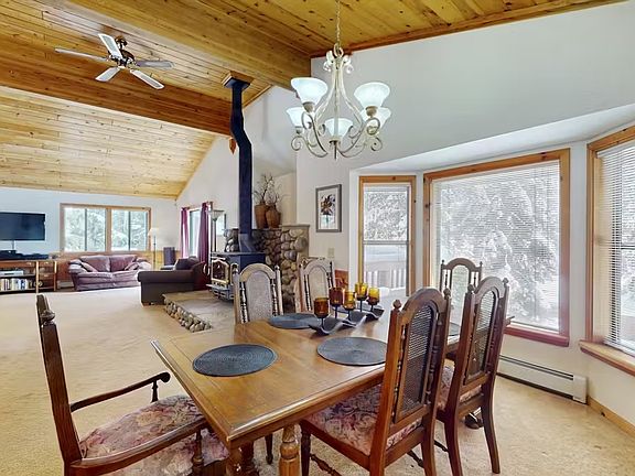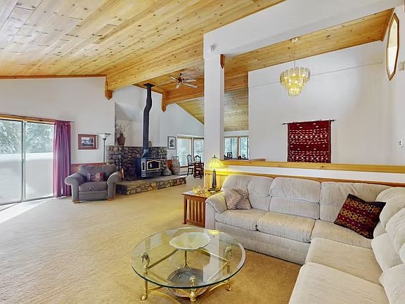 Step inside to discover a stunning open floor plan bathed in natural light from large windows showcasing the beautiful surrounding area. The heart of this home is the expansive living room, perfect for entertaining friends or relaxing after a day on the slopes or lake. Gather around the cozy wood stove on cold winter evenings and feel the authentic warmth of mountain living.