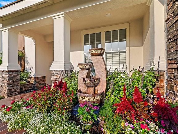 dual vanities, a third vanity area, a roman tub, and elegant travertine and marble finishes. The outdoor space is designed for relaxation and entertainment, featuring a resort-style PebbleTec waterfall pool and spa surrounded by lush landscaping. The property also includes a wide driveway and a two-car garage. Come experience this magnificent home—your perfect blend of luxury and comfort awaits