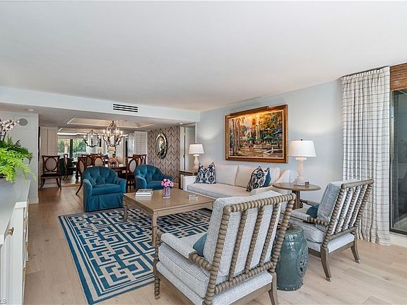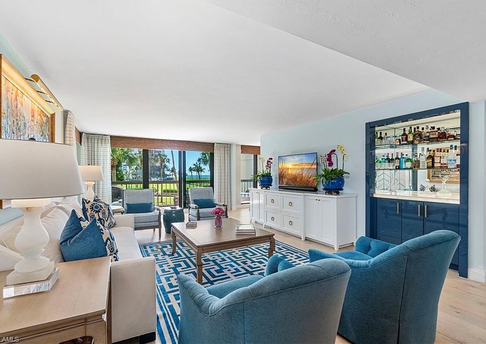 Experience elevated coastal living in this beautifully remodeled two-bedroom, two-bath residence with over 1,800 square feet of living space at the Esplanade Club in Park Shore. A high-end renovation brings a modern sense of elegance with a brand-new kitchen completed in 2024 featuring custom cabinetry, premium quartzite countertops, and top-of-the-line appliances including a Wolf range and Sub-Zero refrigerator, while the bathroom renovations showcase refined finishes and spa-inspired design. The open living and dining areas flow seamlessly onto a wraparound balcony capturing sweeping Gulf views, and a custom-lit granite bar adds ambient warmth perfect for entertaining. The primary suite offers his-and-hers closets, dual sinks, and a walk-in shower with multiple showerheads. Esplanade Club provides resort-style amenities including a beachfront pool and spa, modern fitness center, tennis and pickleball courts, and a dedicated dog park. With direct beach access, 24-hour security, and a vibrant social atmosphere, this move-in-ready residence embodies the essence of Naples beachfront living. Residents also enjoy the opportunity to lease or purchase a boat slip at the nearby Venetian Bay Yacht Club, offering ideal access to boating and the open waters of the Gulf.