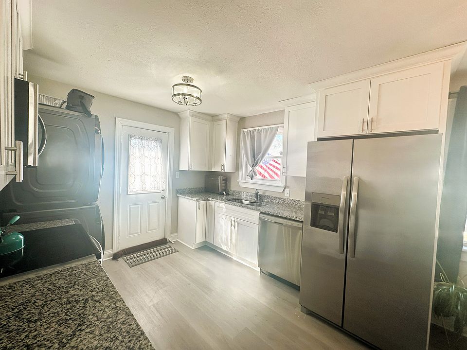 Open living room, dining area, and kitchen with smooth transition through all areas. Stackable washer and dryer in kitchen area. Clean, sharp looking kitchen with granite counters and stainless steel appliances provide a classy, modern feel to the home.