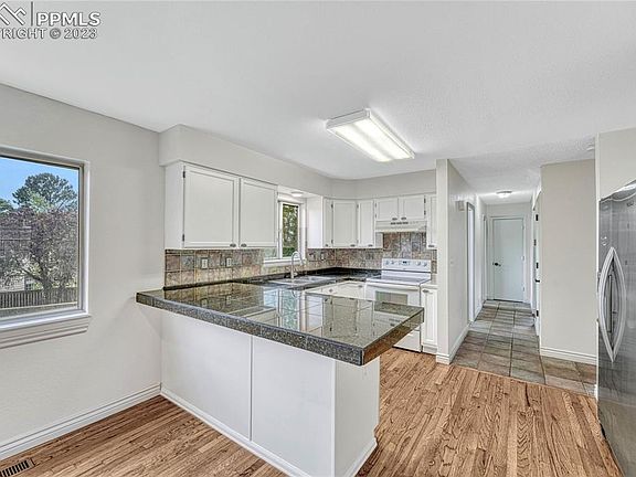 5 bedroom house in the heart of The Meadows. Open floor plan with vaulted ceilings, new interior paint, real hardwood floors, wood burning living room fireplace, formal dining room, larger size yard, full fenced with new sod. Large primary suite has vaulted ceilings, lots of natural lighting, walk-in closet w/built-in shelves, tile floors, and tasteful barn door. Upper level also includes an additional 3 bedrooms and full bath with a dual sink vanity. Basement was recently completed with a good size bedroom, 3/4 bath with beautiful stone and tile, dry bar, cabinets, mini frig, and 2nd family room. Whole home attic fan, radon mitigation system, covered front porch. Close proximity to I-25, DTC, elementary, middle, & high schools, several parks, hiking & biking trails, tennis courts, golf courses, hospital, stores, Outlets at Castle Rock, Taft House, Grange, The MAC, & more.