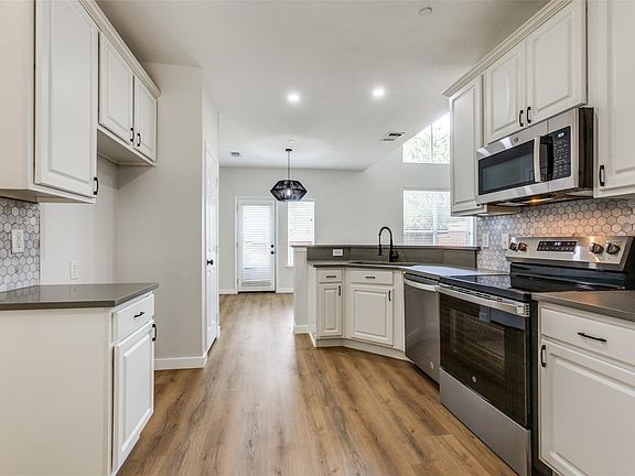 Beautiful 2-bedroom, 2-bath townhome in the heart of Frisco ISD. This two-story windows fill the open living area with natural light, complemented by luxury vinyl plank flooring and modern lighting. The chef-inspired kitchen features quartz countertops, GE stainless steel appliances, under-cabinet lighting, sleek hardware, and a deep undermount sink perfect for everyday meals or entertaining. Upstairs, a split-bedroom layout offers privacy, with spacious rooms, upgraded carpet, and a remodeled primary bath showcasing a vessel sink, modern vanity, and fresh finishes. Additional updates include new ceiling fans, bathroom fixtures, door hardware, and interior paint. Enjoy a private patio with a small green space for pets or relaxation. Conveniently located near major highways, shopping, dining, and entertainment, this home blends low-maintenance living with unbeatable convenience.