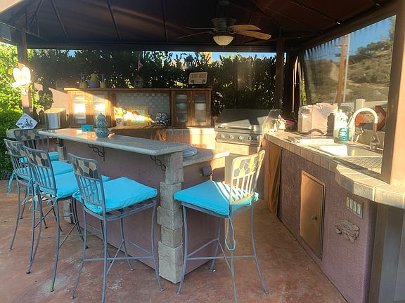 Outdoor living is a highlight here. The private shaded patio comes fully equipped with a patio set, seating area under a covered gazebo, full kitchen set-up outside wiht barbecue, outdoor fridge, microwave, sink, Bosch range, and built-in cabinets. You even get your own pool table for hosting friends or enjoying warm evenings outside.