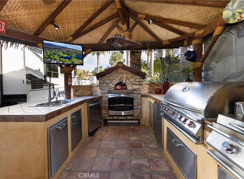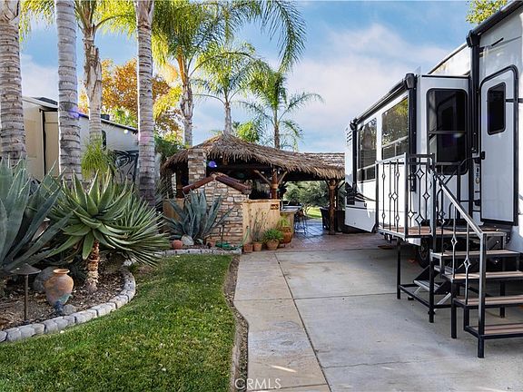 Step into this stunningly beautiful lot which has scenic waterfall views and breathtaking sunsets. As you move though the build-out you’ll find a well-designed kitchen with a built-in oven, BBQ grill with a countertop side burner, double basin sink, undercounter refrigerator,, pizza oven. living room with Large tv and fireplace. At the rear of the property, you’ll find additional space to sit and enjoy a peaceful moment in the sun. Don’t miss this spacious lot which provides ample room for a large RV with full utility hookups, RCRVR is an impeccable RV community with pride of ownership throughout and offers robust amenities: 14-hole Executive Golf Course, two clubhouses and meeting rooms, five swimming pools with spas, pickleball and tennis courts, and fitness center