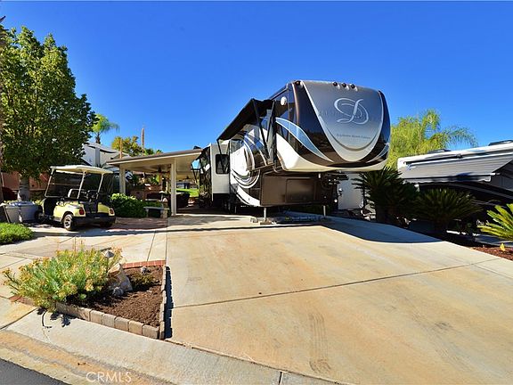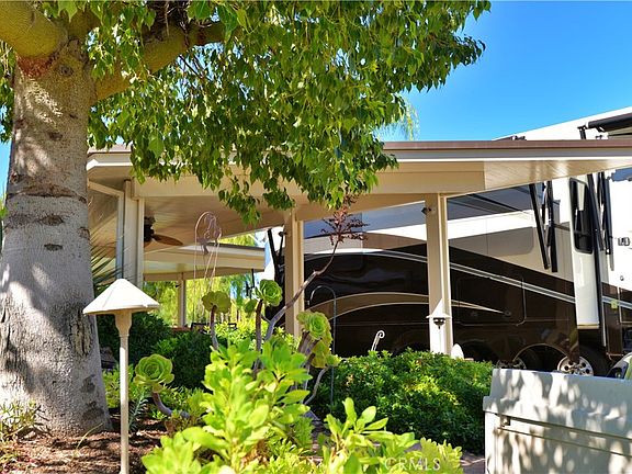 Welcome to "THE LOOP"! A sought after location within the resort. With a custom alumawood structure, sweeping golf course views, mature landscape, water features and surrounding countryside makes this lot a must see on your property tour. Just twenty minutes outside of Temecula, Ca. in the hills of wine country at an elevation of eighteen hundred feet makes for comfortable living any time of year. With Palm Desert and high end shopping on El Paseo forty five minutes away and the coast just over an hour, this resort RV lot is in the ultimate Southern California location. The lot itself is situated on a slight corner facing north/west for early morning sun and beautiful evening sunsets. An established shade tree and stone walking path just beyond the golf cart area, frames the entrance and welcomes you into a bistro seating area, TV niche and gas fireplace. Chef style galley kitchen with overhead TV captures endless views of the fairway, water features and palm trees. Stainless steel grill, drawers, corner sink and dual mini fridge(s) and adjacent bar provides plenty of room to host guests. A formal dining area allows for comfortable seating. An additional raised seating area towards the rear of the lot offers a place to relax and take in incredible views. Resort boasts a 14 hole executive golf course, 5 pools, spas, tennis courts, pickleball courts (several just added), dog park, general market, coming soon restaurant, laundry facilities/showers, fishing lake and variety of resort activities throughout the year. No age restriction.