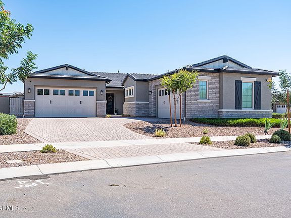 Better than new!! Beautifully upgraded & move-in ready, this 3,200+ sq ft single-story stunner in Eastmark offers 3 spacious bedrooms, 3.5 baths, an office & large flex/teen room. Perfectly situated on a premium corner lot w/ no two-story neighbors & a community park across the street, this home features a welcoming courtyard entry, soaring 10-12 ft ceilings, & an open layout filled w/ natural light. The chef's kitchen is a dream w/ Monogram appliances, 36'' gas cooktop, dual dishwashers, oversized island, quartz countertops, custom soft-close cabinetry, farmhouse sink, walk-in & butler's pantries, hidden outlets & under-cabinet lighting. The elegant primary ensuite is spa-like w/ an oversized tiled walk-in shower, double vanities & closet w/ direct laundry access. Additional upgrades include custom built-ins, motorized window shades, wood plank tile throughout (no carpet), modern trim & finishes & two 2-car garages (1 w/ mini-split A/C, both w/epoxied flooring). Step outside to your own private resort on a 14,500+ sf lotcomplete w/ an expansive covered patio, outdoor kitchen, built-in firepit w/ seating, pavers, turf, citrus trees & garden area. Energy-efficient features include dual-zone HVAC, whole-house filtration, RO system, plumbed for soft water, & w/fiber-wired internet. Eastmark residents enjoy world-class amenities including pools, splash pads, parks, skate park, Steadfast Coffee, The Mark clubhouse, community events & more. No expense was sparedthis was built as a "forever home" but work is taking the seller out of state. Truly a rare opportunity!