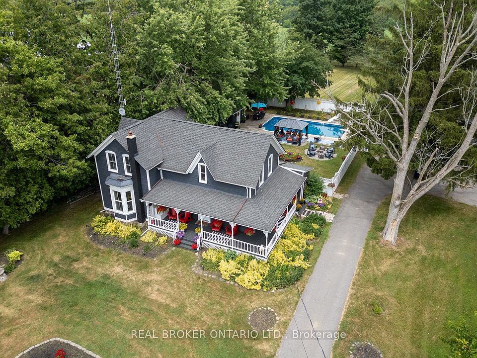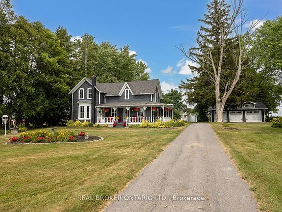 Welcome to this charming century home, where timeless character and thoughtful updates come together on a scenic Approx. 1.24-acre lot in Rural Clarington. Set back from the road, this lovingly maintained 2-storey, Circa 1870 home offers approx. 2000 sq ft of living space and has been cared for by the same family for over 30 years. A long driveway leads to a detached 3-car garage, while a wraparound, covered porch with a bench swing, invites you to slow down and enjoy the peaceful views. Inside, a spacious foyer welcomes you in. Just off the entrance, you'll find a private office and a beautifully updated 5-pc bathroom with heated floors, a walk-in shower, dual vanity and clawfoot tub, ideal for relaxing after a long day. The kitchen is truly the heart of the home designed for gathering and everyday living. Featuring quartz countertops, a large center island, decorative ceiling, backsplash, pendant lighting, and ample cabinetry, it also boasts a walk-in pantry with a second sink, prep station, and open shelving. Walk-outs to both the back deck and the front porch make indoor-outdoor living easy. Adjacent to the kitchen, the open-concept living room offers a bright space with a propane fireplace, bay window, built-in shelving while the separate dining room offers backyard views. Main-floor laundry, with access to the basement, adds function and convenience. Upstairs, you'll find four bedrooms, all with hardwood flooring, and a full 4-pc bathroom. This property offers the best of both worlds, resort-style relaxation as well as wide-open space for family adventure activities. The fully fenced backyard is an entertainer's dream, with an inground saltwater pool with a slide, space for lounging, BBQing and complete privacy. Beyond the fence, the yard continues with open grassy space & a soccer net, with peaceful farmland all around, there's room to play, roam, and create lasting memories without ever leaving home.