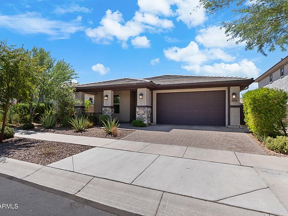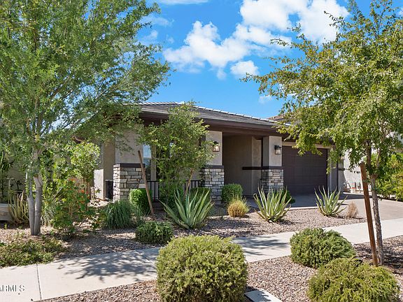 Located in the highly desirable Eastmark community, this beautifully maintained single-story home offers 4 bedrooms and 3 full bathrooms with an open, functional layout. The kitchen features quartz countertops, a custom backsplash, and plenty of space for cooking and entertaining, while tile floors run throughout the main living areas for a clean, modern feel. The primary suite includes dual sinks, a soaking tub, and a separate shower for a true retreat. Step outside to enjoy views of the Superstition Mountains from the front porch, or relax in the professionally landscaped backyard complete with travertine hardscape, a fire pit, fountain, and mature trees for added privacy.Additional features include a 2-car garage, covered patio, block and wood fencing, and low-maintenance landscaping with sprinklers in both the front and back yards.