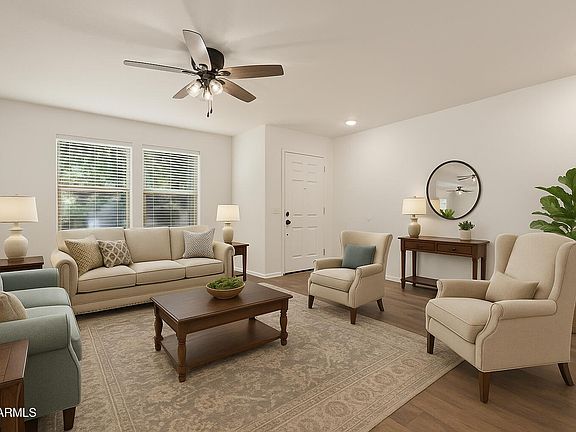 Immaculate 4-bed, 2-bath single-story home in Maricopa Meadows with 1,925 sq ft and no carpet—laminate flooring throughout. Recent upgrades include a new water heater (2025), belt-drive garage opener, and Pearl-certified insulation. AC replaced in 2020. Spacious layout with split floor plan and walk-in primary closet. Backyard features turf, pavers, and a pergola—great for relaxing or entertaining. Located in scenic Maricopa Meadows with trails, parks, a lakefront entrance, and a disc golf course. Nearby schools and easy access to Copper Sky, shopping, and dining. Pre-paid home warranty included. One of Maricopas most desireable communities.