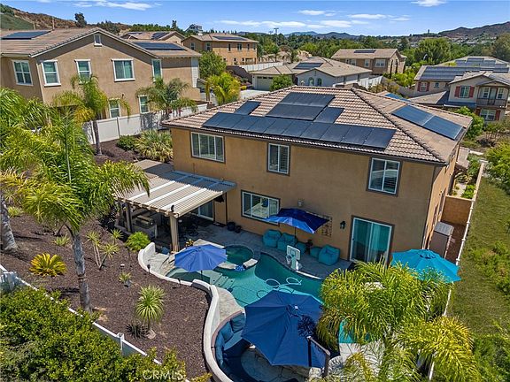 Welcome to 45559 Zander Ct, a 4,121 sq ft luxury home where elegance meets comfort in the prestigious Terracina community of South Temecula. This exquisitely upgraded 7-bedroom, 4.5-bathroom property boasts expensive upgrades throughout, including stunning Italian tile plank flooring, bathroom tilework, wood feature walls, and a remodeled kitchen—perfect for culinary enthusiasts. The majority of the indoor and outdoor furniture is for sale or can be included in the sales price for the right offer. One of the home’s most impressive highlights is the spacious 1,121 sq ft guest casita with a private entrance, offering 2 bedrooms, 1 bath, a laundry room, a kitchenette, and its own living space—ideal for extended family or visiting guests. The resort-style backyard, complete with a pool, spa, and firepit area is the ultimate space for relaxation and entertaining. Plus, the 3-car side by side garage is long enough to fit a full-sized SUV, providing ample parking and storage options. With energy efficiency in mind, this home includes a 54-panel solar system powered by Enphase inverters, pool solar to keep the pool warm without breaking the bank, and a Tesla charger for electric vehicles. Additionally, a whole-house water filtration system by Blue Water, complete with a 100-gallon tank, ensures pure, filtered water throughout the entire home. Located near top-rated schools, shopping, dining, and easy freeway access, this move-in-ready gem offers an extraordinary lifestyle with low HOA fees in one of South Temecula’s most sought-after neighborhoods. Don’t miss your chance to own this remarkable home