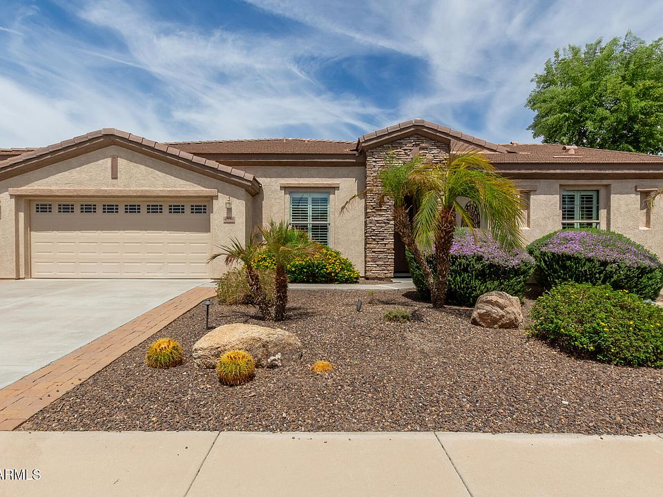This Beautiful ''Cimarron'' Model split floor plan in Trilogy at Power Ranch is on a North/South facing corner lot!! The open-concept design provides a seamless flow, offering a bright & spacious environment perfect for entertaining or simply relaxing. Plantation shutters throughout!! Flooring includes travertine tile, marble in baths & laminate in bedrms. The guest suite has its own bath. The flex room is perfect for additional living space, media room, den or even a bedrm. The kitchen is an entertainers delight with plenty of cabinet space, stainless appliances, granite countertops, pull out shelves, under cabinet lighting, R/O, wall pantry & a large prep island along with a huge breakfast bar. A perfect entertaining space. Kitchen over looks enclosed patio w/pergola & privacy wall. There is a beautiful formal dining room. The open great room with recessed tray ceilings, built in shelving & gas fireplace overlooks the beautiful landscaped backyard with large covered patio, artificial turf & lemon/lime trees. The primary bedrm suite is truly spacious with separate exit to back patio, 2 large walk-in closets & a bonus room that would make the perfect office/craft room/home gym, you name it!! The primary bath is huge featuring two separate vanities, separate walk-in shower & soaking tub. This home has Plenty of areas for storage. The laundry room has cabinets, a sink & direct access to garage that has extra cabinets!! This resort style active adult community features many amenities such as golf, tennis, pickleball, bocce, pool/spa, workout facility, clubs & so much more!! This amazing home has it all. Welcome Home!!
