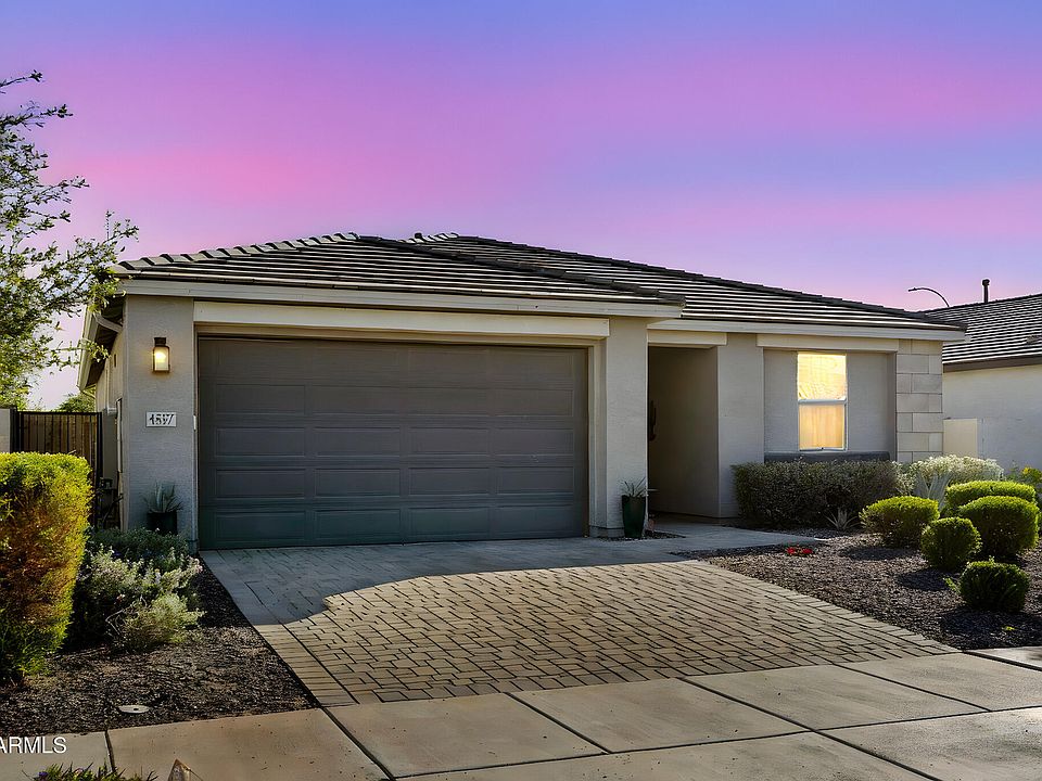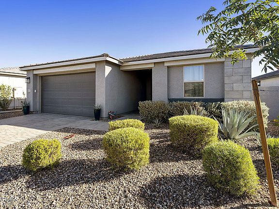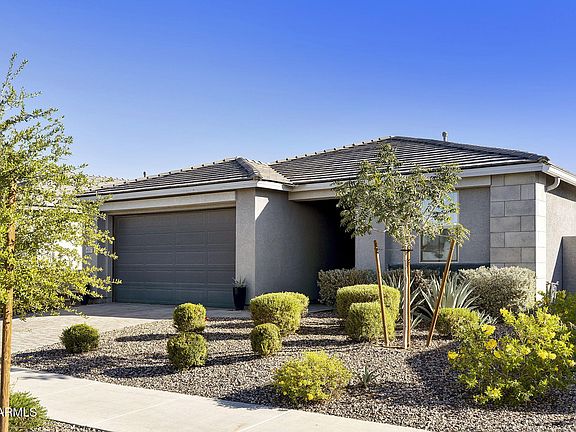 Welcome to this beautifully upgraded 3 bedroom, 2 bath home with den in the highly desired community of Eastmark! This popular split-floor plan offers privacy and flow, complementing the popular open-concept layout that blends warmth and sophistication. Secondary bedrooms are generously sized, and the versatile den provides the ideal space for a home office, or playroom. The gourmet kitchen features a large island perfect for casual dining or entertaining guests, soft-close cabinetry, and custom tile details. The primary suite includes a spa-like walk-in shower, dual sinks and custom barn door. Outside is your private oasis with a heated pool, spa, travertine decking, firepit, and a ramada with built in BBQ, fridge, and Stunning mountain views perfect for entertaining and relaxation.