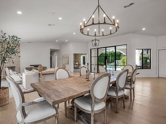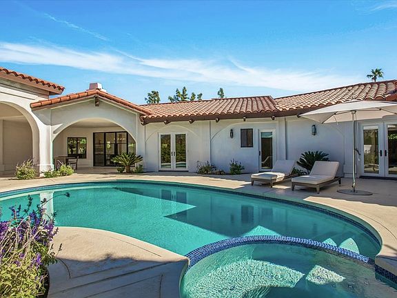 This magnificent Spanish-style home is located in the heart of prestigious Indian Wells on a quiet cul-de-sac. The almost 3,700 sf newly remodeled 5BR/3.5BA pool home offers views, an open floor plan, and all the charm & amenities you're looking for in a desert home. South mountain views from the arched courtyard & saltwater pool/spa. Double door entry leads into living areas with high ceilings, new 9-inch white oak flooring throughout, freshly painted walls, & all new furniture, rugs, & drapes from Restoration Hardware and designer boutiques specializing in sustainable materials. Huge entertainer's kitchen w/ large waterfall island, 48" Wolf range, Subzero refrigerator, Asko dishwasher, farm sink, Rohl fixtures, LG washer and dryer, storage galore, quartz countertops, & kitchen nook. Large living room with projector television, separate family room, dining room with 11-ft table, office, & gym. The gorgeous over-sized master suite provides a relaxing retreat w/ generously proportioned newly remodeled master bath w/ freestanding tub and walk-in shower, walk-in closet, French doors, & cathedral-domed ceiling. Linen and down bedding for a luxurious night's sleep. Private backyard with delicious mature citrus trees.