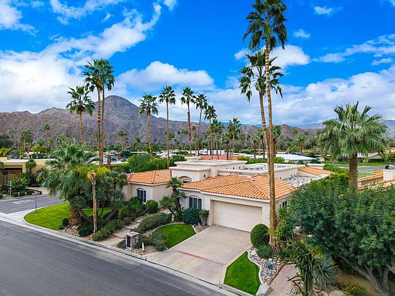 This property offers stunning views of the southern mountains and features impeccably maintained landscaping. The home includes four bedrooms--one with built-in cabinetry suitable for use as an office--and four ensuite bathrooms, in addition to two half baths (a powder room and one conveniently located near the pool area). Upon entry, a step-down living room with a fireplace, high ceilings, and dramatic windows creates an inviting atmosphere. Adjacent is a formal dining room complete with a wet bar. The kitchen is equipped with granite countertops, stainless steel appliances, and a central island, adjoining both a breakfast area and a spacious den with a fireplace. The master suite features French doors opening onto a covered patio that overlooks the serene private yard. The master bath provides a generous walk-in closet, double vanities, and a sauna. Many rooms offer views of the expansive, lush backyard, which boasts a tropical-style pool and spa with vistas of Mt. Eisenhower. Call for your private showing.