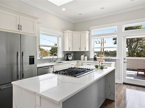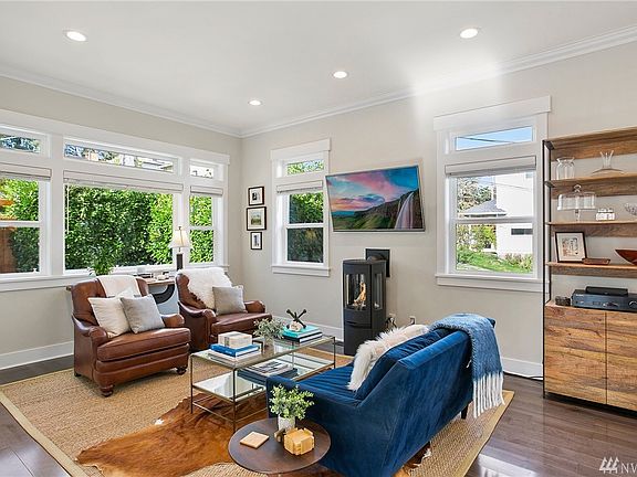 A 1908 classic completely reimagined in 2019. Sun filled rooms, high ceilings, modern finishes, HW floors and Cascade views delight. Open concept upstairs w/ kitchen/dining/living and bedroom with full bath. Cooks kitchen with gas stove, quartz counter tops and SS appliances. Gas fireplace in LR. Downstairs has large bonus room, main bedroom and bath, 2 bedrooms w/ shared bath, covered patio and laundry. Pvt court yard, 2 car off street parking, shed, dog run. Walkable. Easy access to 520/I90