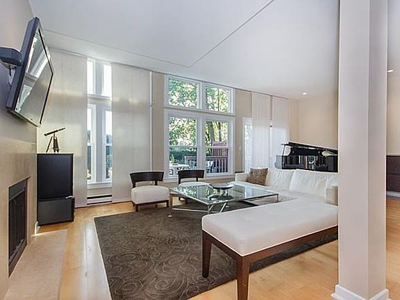 Payson Estate. Two bedroom, 2.5 bath condominium located at one of the highest points in Watertown atop Oakley Country Club. This contemporary carriage house features an open floor plan with two sunny exposures, a wood burning fireplace, floor to ceiling windows, maple hardwood floors, 10' ceilings on first floor and built-ins from Montage of Boston. The modern galley kitchen has newer appliances, granite countertops and recessed lighting. The master bedroom suite offers abundant light, a Juliette balcony with seasonal Boston views and a modern double-vanity master bathroom. Private patio and a garden area off living room. Updates include new windows, new copper and architectural-shingle roof as well as newer heating, AC and hot water systems. Easy walk to shops and cafes in Cushing Square along with public transport to Cambridge. Guest parking and lovely South-Facing tranquil pool.