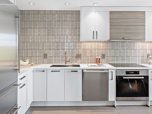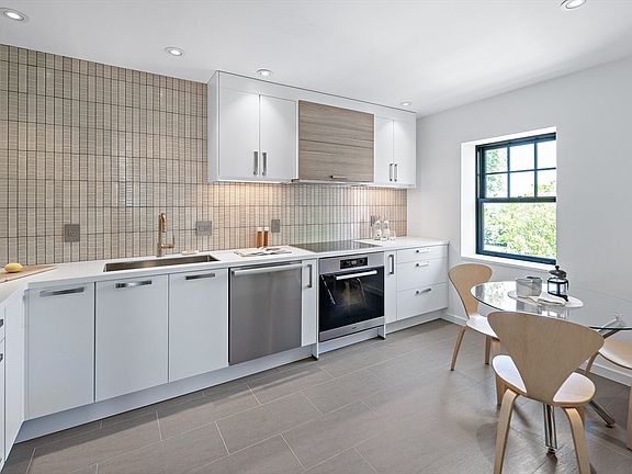 Payson Estate. Top-floor 2 bedroom, 2.5 bathroom condominium with panoramic Boston skyline views in Elevator-Building. Professionally-designed and gut-renovated, this corner unit merges Tudor Architecture with a modern minimalist interior. Bright and airy throughout with 3-exposures, cathedral ceilings, skylights, wide plank flooring, new custom windows & doors by Kolbe and Kolbe, kitchen cabinets by Nobilia of Germany & stainless steel appliances by Miele & Liebherr. Spacious master bedroom suite features a walk-in shower, radiant floors and custom wardrobe by Fimes of Italy. Other amenities include full-size in-unit laundry, new heating/air-conditioning, deeded parking along with guest parking. Spacious walk-in storage room for all your downsizing woes. Easy walk to cafes & shops in Cushing Square with public transport to Cambridge. South-facing pool for summer get-togethers. A tranquil and unique setting.