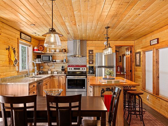 As you approach this remarkable home, you'll immediately be captivated by its striking log cabin exterior. The exterior remodel has expertly transformed the home into a rustic haven, complete with handcrafted logs, charming shutters, and a welcoming front porch that beckons you to unwind and enjoy the tranquility of nature.