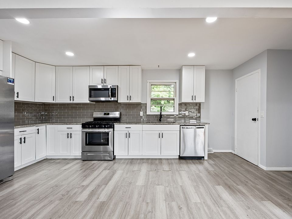 Welcome to this beautifully renovated three-bedroom ranch! The spacious living room features gleaming hardwood floors and opens seamlessly to the bright kitchen, showcasing granite countertops and stainless steel appliances. The main level is complete with three bedrooms and a full bath. The lower level offers a fully finished basement with a full bathroom and flexible space ideal for a home office, recreation room, or playroom. Don't miss this move-in ready home-schedule your showing today!