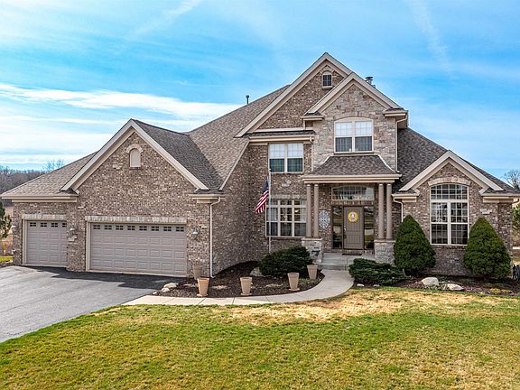 Hot property! Fabulous custom home & beautifully maintained! 2 story with main floor oversized master suite. Tall brick & stone exterior & covered front entry. Beautiful landscape, paver patio plus upper deck. Soaring ceilings in great room open to kitchen with hardwood, granite center island, pantry & custom cabinetry and family room upstairs. 9' ceilings in LL ready to finish plus a full bath. Roof 2022, furnace & AC 2021.