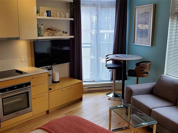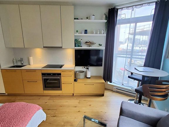 Harbour viewsVinyl floorsBuilt-in queen wall bedQuartz counter topsCommon rooftop deck