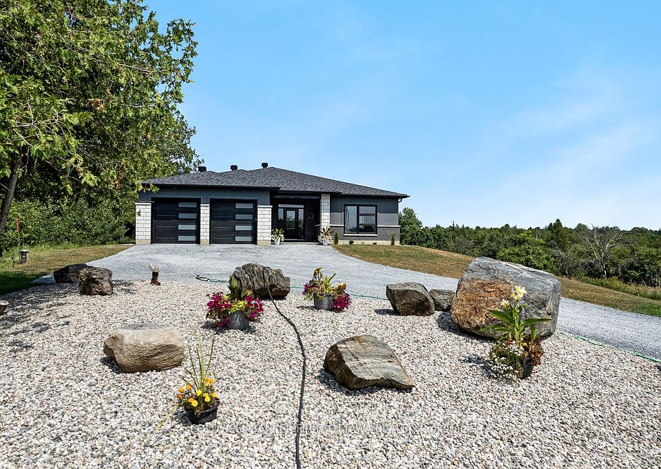 With eloquence on 2.7 acres, new 2023 bungalow is perfectly sited on knoll for sweeping panoramic views of the gentle countryside and magnificent sunrises. This energy-efficient ICF home also has attached double heated garage. Built by quality builder Hollington Homes, 3bed, 2 full bath home offers a sophisticated style with premium extras. Exterior CanExel siding accented by attractive brick and stucco. Impressive front door framed by side glass panels and decorative transom creates light airy entry into foyer with convenient double closet. Luxury vinyl plank floors with radiant heating flow thru-out the home. Sun-filled living room has windows flanking modern Napoleon electric fireplace with log mantle; on other wall under large window is custom sitting bench with storage. Dining room patio doors open to expansive screened sunroom with ceramic floor and views of amazing vistas. Sparkling white bright kitchen has Cristallo quartz counters, textured subway backsplash, crown moulding and under cabinet lighting; the complementary two toned island-breakfast bar sits five comfortably. Mudroom has laundry centre with closet. Restful primary suite features patio doors to private covered patio with pot lights & ceramic floor, private retreat for quiet times. Primary suite also has walk-in combined closet-dressing room with wrap-about shelves and quartz make-up table. Ensuite consists of room with two vanities then, separate room for rain head shower with porcelain tile plus, a linen closet. Two more large bedrooms and 4-pc main bathroom with crystal reflection lighting. Home has heat pump for heating & cooling. Hot water on demand. Architectural roof shingles. Attached insulated double garage finished with drywall, pot lights and radiant wall heater. Lovely landscaped perennial gardens and mature apple grove. Home under Tarion warranty. Hi speed. Cell service. On paved township maintained road with mail delivery & school bus pickup. 20 mins Perth or 12 mins Carleton Place.