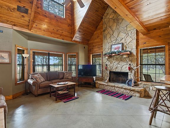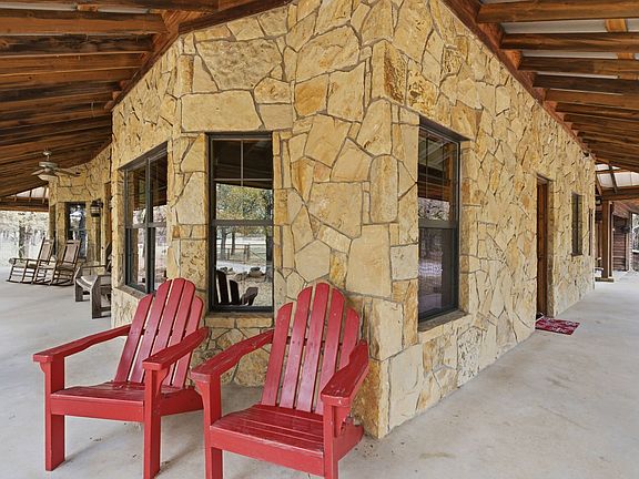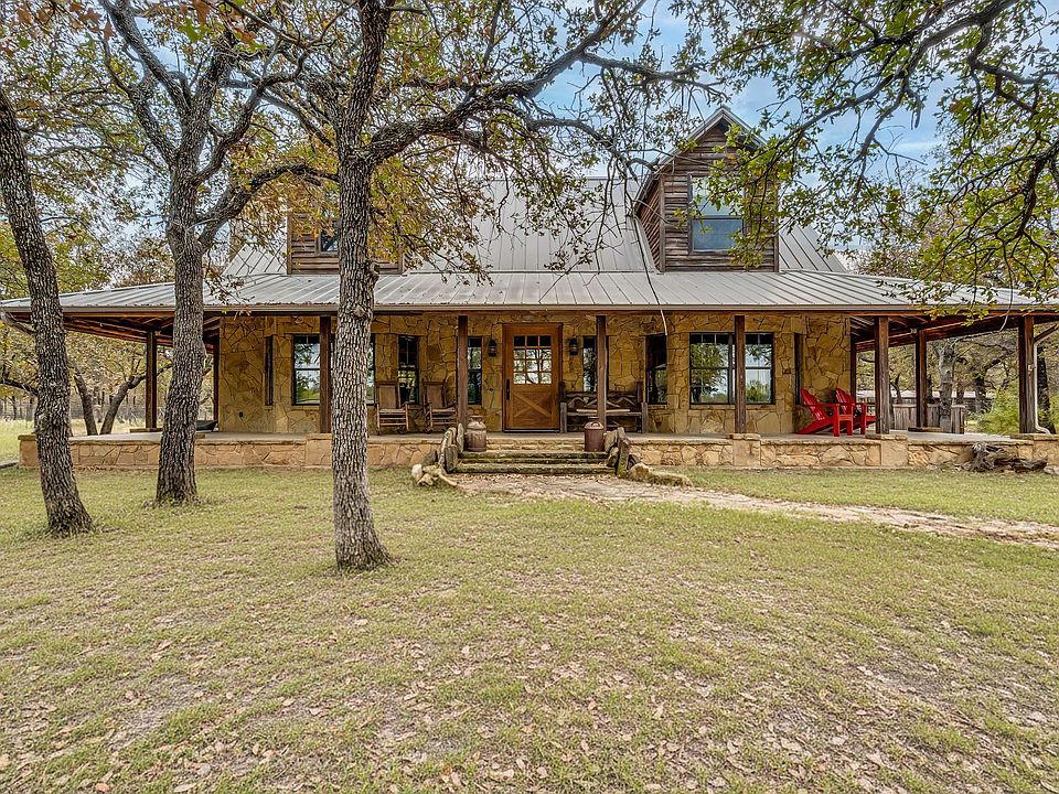 Tucked behind a gated entrance and winding gravel drive, this striking wood-and-stone home sits on 4.8 acres of trees and pasture in the 7R Retreat Community. The metal roof, full wrap-around concrete porch, and inviting front steps framed by native stone give it the feel of a classic Texas lodge from the moment you pull in. Inside you will find 3 generously sized bedrooms and 2.5 bathrooms. The kitchen opens to the living area providing comfort for daily living. With an open feel, wood counters, large commercial refrigerator and other built in appliances it is ready for entertaining or comfort. The primary suite is conveniently located downstairs with its ensuite bath that features true relaxation in the oversized tub, a separate shower, double vanities and walk in closet. Downstairs also features a half bath and laundry room with sink. An upstairs area overlooks the main living and can serve as a game room, office, or flexible second living space, with large secondary bedrooms on each side, perfect for guest, family, or just having extra space. This home has soaring ceilings, rich wood finishes, and a massive stone wood-burning fireplace create a warm, lodge-style living area with picture windows that frame the surrounding oaks.