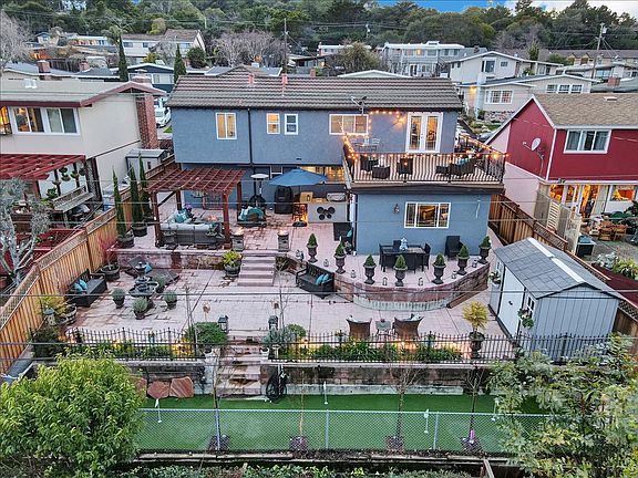 This gorgeous remodeled Spanish style home offers 3 bedrooms and 2.5 baths. The living room has 18ft. ceilings that opens up to the dining room. The gourmet kitchen has granite countertops with a center island, a walk-in pantry, double ovens, gas stove and LG appliances. The half bath and laundry room are located off the kitchen. The open concept continues through the home to the large family room. The second floor includes an amazing master suite that boasts 12ft. beam ceilings with Anderson custom windows. The spa like master bath has a freestanding soaking tub, walk-in shower, double sinks and a 17ft. long walk-in closet. Both of the other bedrooms have newly added custom closet doors and carpet. One bedroom has French doors that leads to the large second deck with views of the bay. Everyone will love to entertain on the 3 tiered backyard. It includes a custom pergola with chandler, fire features, BBQ island, Spanish fountain, putting green and additional storage.