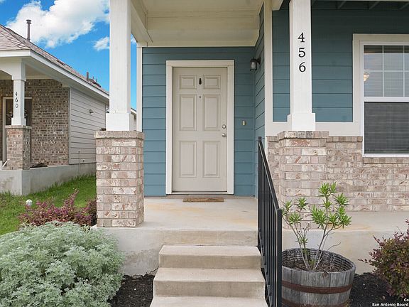 Welcome to this 3/2.5/2 Gem of a home in the sought after Trace Neighborhood. This sophisticated, and very well kept home, has quite a bit to offer, such as a second story balcony off the master bedroom and graceful vinyl plank flooring. The living room is spacious with lots of natural light. The kitchen has stainless steel appliances, built in microwave, gorgeous white cabinets that offer plenty of storage, walk in pantry, beautiful black subway tile and the door to the back has a large doggie door built in. The light filled master bedroom is upstairs with ceiling fan, full bath with a striking oversized tiled Shower. The secondary rooms have plenty of room for the littles or guests. The back yard is tranquil and ready for your outdoor entertaining. The home also has a detached two car garage and a water softener! This fantastic neighborhood features a resort style pool, volleyball and sports courts, hiking and biking trails, park, pavillion and amenity center. The location offers easy commutes to San Antonio or Austin. Don't miss your opportunity to own this piece of Texas heaven!