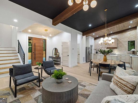 Mountain modern meets contemporary luxury on the banks of the Ellijay River. Set within Goose Island Hideaway, an intimate, gated community, this brand-new fully furnished residence is a masterpiece of luxury & modern design, set on a secluded .9-acre lot boasting over 150 ft of private river frontage. With trout fishing just steps off the back & the soothing sounds of the rushing river surrounding the home, you can't help but relax. As you step through the striking solid Mahogany front door, you'll immediately appreciate the meticulous attention to detail throughout the home. The main level features an open concept floor plan, highlighting stunning exposed wooden beams, Taj Mahal natural quartzite countertops & a genuine Texas Limestone fireplace & kitchen backsplash. Custom wood cabinetry and European White Oak flooring flow seamlessly throughout the residence, exuding sophistication & warmth. The main living area extends to expansive deck space, perfect for entertaining, with additional dining & lounge areas, as well as a cozy fireplace - all overlooking the picturesque river. The home offers two luxurious primary suites, one on the main level & another upstairs. Both suites feature opulent soaking tubs, double custom vanities & custom tile showers. The upstairs primary suite further indulges with a private balcony, perfect for enjoying the serene views & sounds. The terrace level presents two additional guest rooms, two well-appointed bathrooms & extra living space, promising comfort & privacy for visitors. The terrace deck provides even more entertaining space and includes a staircase for easy access to the river, making it an ideal spot for relaxation. Offered fully furnished with high-end, professionally designed interiors, this exquisite home is move-in ready - all you need to bring is your fishing pole. Experience the best of luxury mountain living in this remarkable home, where every detail has been curated for your comfort and enjoyment.