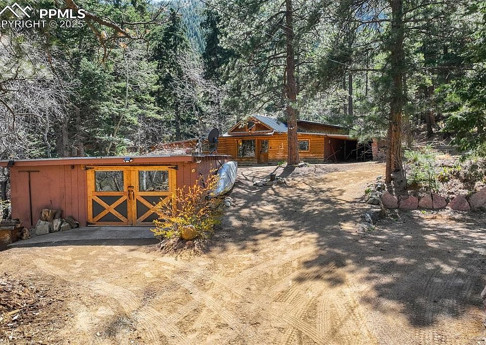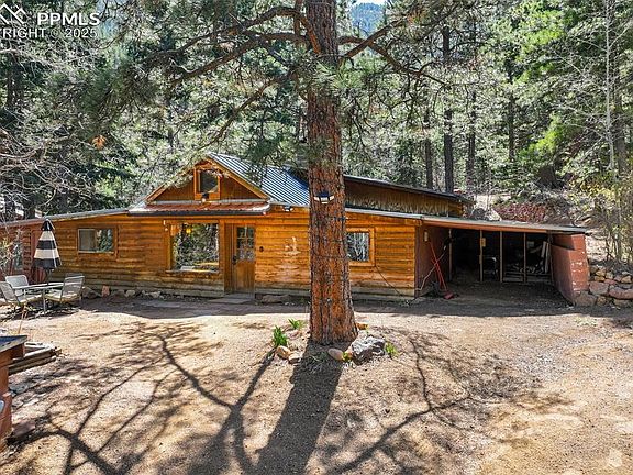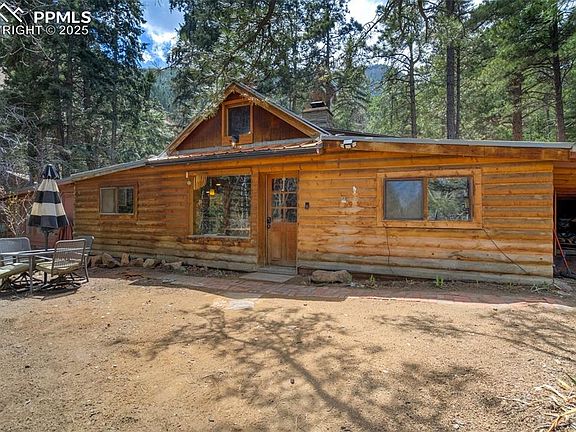Nestled among the trees in the heart of Cheyenne Canyon, this charming 2-bedroom, 1-bathroom log cabin offers a rare blend of rustic character and tranquil living. Set on a beautifully treed lot with the soothing sounds of a nearby creek, this home invites you to unwind and connect with nature. Step inside to find a cozy living room featuring vaulted ceilings, skylights, concrete floors, exposed log beams, and a wood-burning fireplace—perfect for chilly Colorado evenings. The partially renovated kitchen includes a new gas stove/oven and provides a solid foundation for your own personal updates. The primary bedroom offers a unique bonus space that can serve as a sitting area, office nook, or walk-in closet. The second bedroom is truly a treehouse-style sanctuary, surrounded by windows on three sides for a 260-degree view of the natural beauty outside and abundant natural light throughout the day. The updated bathroom features a dual vanity, newly tiled walk-in shower, a classic clawfoot tub, and built-in storage for linens. Additional highlights include: mini-split A/C system for year-round comfort, covered carport that doubles as a workshop area, private neighborhood access to hiking trails, close proximity to Helen Hunt Falls, Seven Bridges, North Cheyenne Cañon Park, and outdoor recreation opportunities galore. Whether you're looking for a full-time residence, a peaceful weekend getaway, or an investment with charm and character, this property offers endless potential to make it your own mountain retreat.