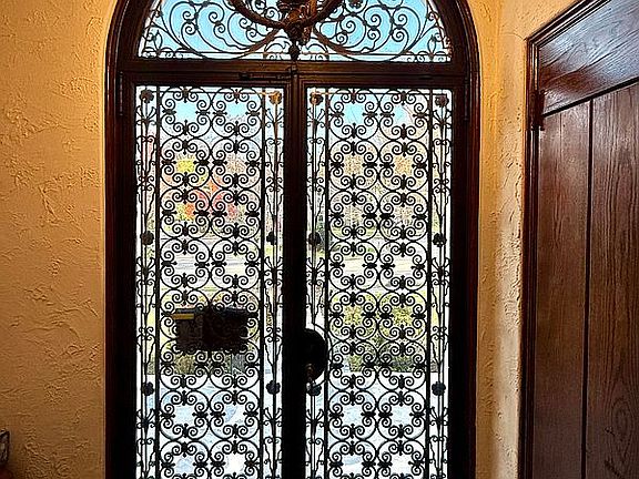 The center hall is anchored by a striking curved staircase, beautifully adorned by patterned tiles in vibrant colors. The house also enjoys decorative archways, handcrafted wrought-iron detailing inside and out, an abundance of French doors and a Spanish-tile roof – all echoing traditional Mediterranean design details.