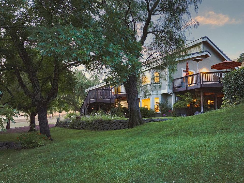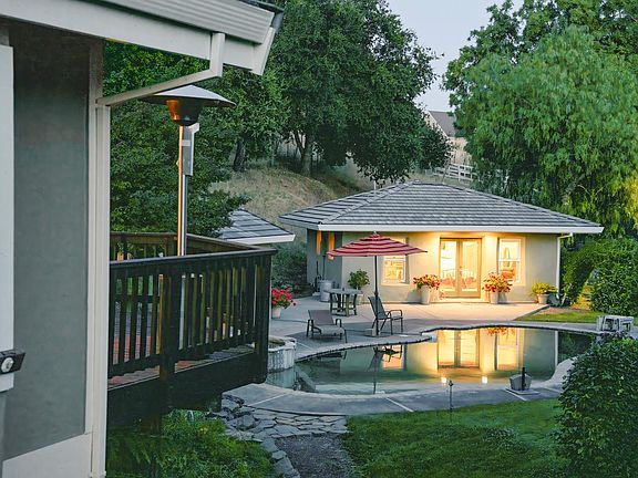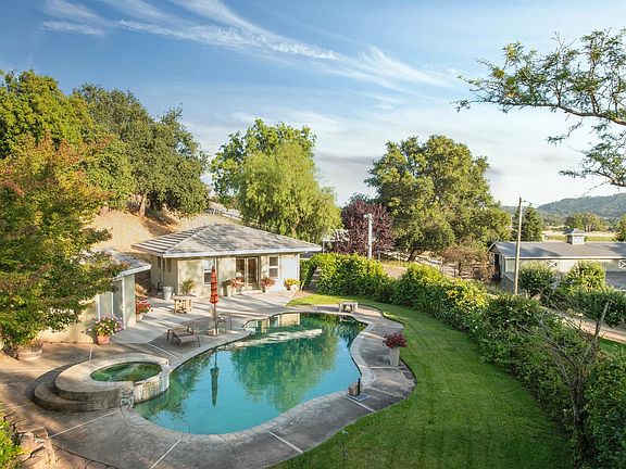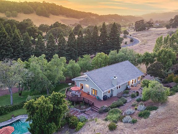 Stunning wine country estate proudly positioned on over 25 prime acres with gorgeous views. Main house features vaulted ceilings, rich hardwood flooring, an expansive living room with stone surround fireplace, chef's kitchen with high-end appliances and double French doors that lead to a wrap-around deck overlooking the swimming pool, spa and lovely pastoral grounds. The adjacent pool house offers additional living space, a kitchenette and bathroom. Interested in horses? This property offers a six-stall barn, paddocks and an outdoor arena. Hobby vineyard and owned solar.