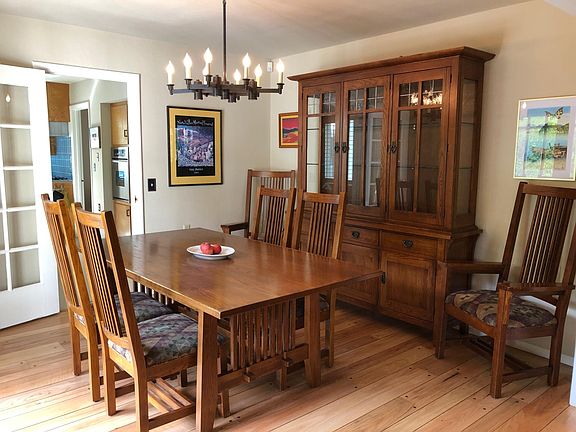 The dining room is furnished with mission style table, chairs, and buffet. Stunning 9-light beveled glass French doors open to the large patio.