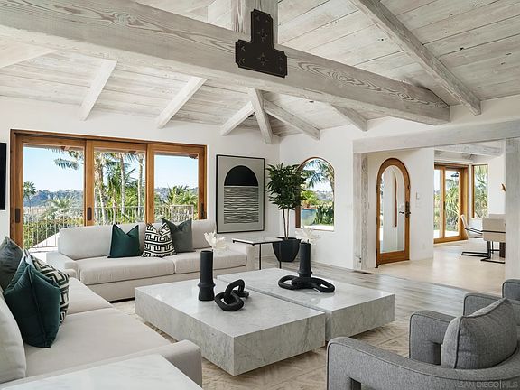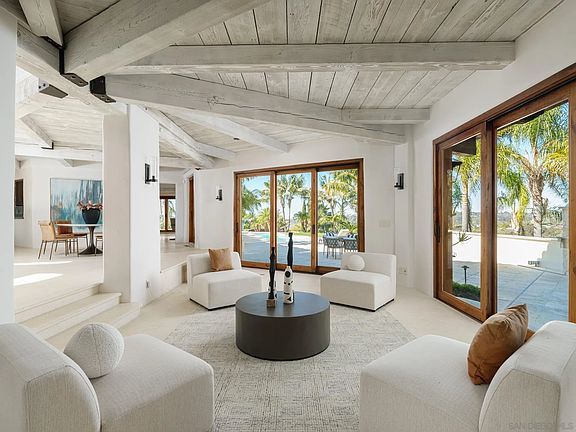 Welcome to a hilltop paradise with panoramic ocean views, nestled on 5.61 acres in the prestigious west-side Covenant of Rancho Santa Fe, with walking trails and ample space for expansion. This magnificent Santa Barbara-style estate, custom-built by Weir Brothers, captures 360-degree views of the ocean, hills, and valleys. Arrive through the gated drive and find a circular courtyard and grounds enveloped in lush, mature botanical gardens. Inside, graceful archways complement dramatic vaulted ceilings of reclaimed wood beams. The heart of the home is the spacious, domed kitchen that opens to a generous wraparound deck overlooking the pool and spa, sauna, outdoor pizza oven, and fire pit. Private quarters include 3 en-suite bedrooms on the lower level and a luxurious upstairs primary suite with panoramic views – each designed for privacy and tranquility. More than a home, this property unlocks an unparalleled lifestyle. The property features a state-of-the-art fire safety and extinguishment system, a comprehensive well with a 15,000-gallon storage tank and 3 reserve tanks, a Wellspring desalination system, whole-house solar and security systems. The flat parcel provides endless opportunities for future expansion – add a guest house, tennis court, or vineyard – all positioned for stunning ocean views. This location is only a short walk to the San Elijo Lagoon Trails and San Dieguito parks, with easy access to the RSF Golf Course, the Village, and Roger Rowe School. A retreat for those who seek privacy, luxury, and a connection with nature. Your sanctuary awaits.