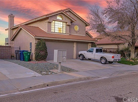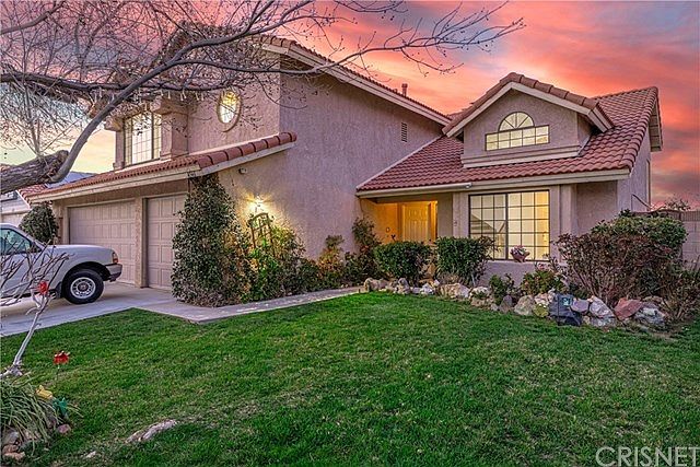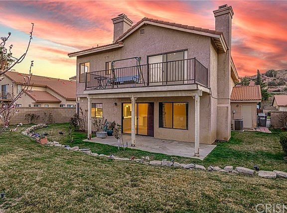 This stunning Rancho Vista two-story home is located in West Palmdale, close to shopping & freeway access. From the open-concept kitchen and living space to the large upstairs bonus room, there is plenty of room for everyone to enjoy. As an added benefit: 1-Bedroom & 1-Full Bathroom is located downstairs! The bright kitchen is open to the den and boasts resurfaced kitchen cabinets along with some new custom cabinetry, quartz counters & a new stove. Additional upgrades include: 1 year old heater, new carpet, fireplaces in den and primary bedroom, updated primary bathroom and finished 3 car garage. You will furthermore enjoy the exterior of this home with block walls, rear yard patio and mature landscaping that includes apricot trees, rose bushes and much more. Rounding out this lovely home is beautiful view of the Antelope Valley from the balcony off the primary bedroom. Don't hesitate to view this home today.