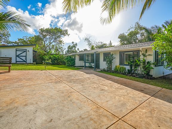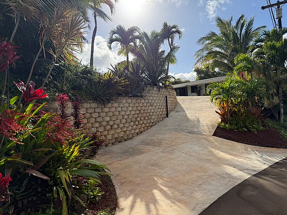 The exterior renovations feature an ipe wood lanai with an outdoor dining area covered by a redwood ceiling with recessed lighting. Newer siding, "Advantage Plus 30 Year" trim, batten boards, fresh paint, new screens, an Ipe screen door, and new gutters are also included. Off the lanai is a lava rock path and an outdoor rain shower with a lava rock base surrounded by river rock. The detached workshop has a refrigerator, a craftsman's workbench, and shelving. Also added is a five-bedroom septic system, a second water meter (for an ADU), a new concrete driveway, an engineered retaining wall, professional landscaping by Kauai Nursery with mature palms, coconut trees, bromeliads, birds of paradise, lobster tail, gingers, gardenia, plumeria, jasmine, orchids, etc., 10+ types of mature fruit trees (Mango, Avocado, Tangerine), irrigation, and lighting.