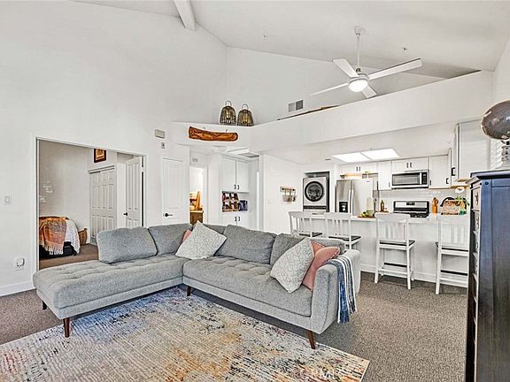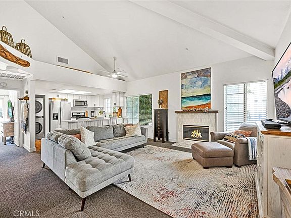 You will love life in this 2 bedroom, 2 bath light, bright, cheery home. Rare high vaulted ceilings contribute to the elegant ambience. Cozy warmth from the fireplace will soothe on chilly beach evenings. Many lovely upgrades will enhance your enjoyment. Both bathrooms and the kitchen have been remodeled with top of the line materials. Beautiful countertops and easy care laminate flooring in kitchen/baths. A huge peninsula counter serves as a perfect dining space. Sale price includes the stainless refrigerator and stackable washer/dryer. The generous primary bedroom accommodates a king bed and has an en-suite bath with 2 basins. An ocean breeze awaits as you step outside the sliding door onto the private balcony. This home is a very private upper unit. But don't worry, there's an elevator for your convenience. Outside your window is a beautiful tree offering even more privacy and a fun feeling of living in a treehouse. Such a wonderful home. The gated complex is a short walk from Trader Joes, restaurants and other services. The famous Christmas boat parade happens nearby. A short bike ride will have you at the coastline with lots of waves and endless ocean views. The peaceful, protected wetlands are just around the corner. When you feel like more activity or nightlife, a short drive /bike ride takes you to downtown HB where you will have fun in iconic Surf City. Don't feel like going out? Stay home and swim in the community pool. 2 assigned parking spaces in the protected, underground garage. Don't wait. Come make this incredible condo your new home; a place to experience all that beach-close living offers. Don't forget to take a look a the virtual tour.